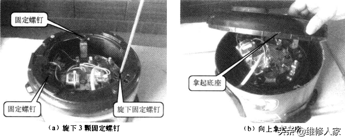 取下电饭煲底盖后,可以看见底座上有3颗固定的螺钉,电饭煲的内部结构也可以看见。用螺钉旋具将这3颗螺钉旋下,3颗固定螺钉旋下后,底座就可拿起。