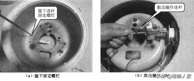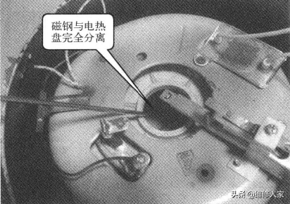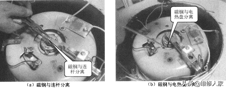 3、磁钢的拆卸 用尖嘴钳将磁钢与连杆分离,再用一字槽螺钉旋具将磁钢与电热盘分离。