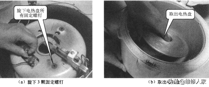 5、电热盘和限温器的拆卸将电热盘底部的3颗固定螺钉旋下后,将电饭煲侧翻,从 电饭煲内锅底部取出电热盘和热敏电阻限温器,完成电热盘和限温器的拆卸。