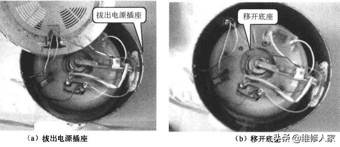 底座拿起后,可以看到内部电源线和电源插座是相连的,拔掉电源线,就可完成底座的拆卸。