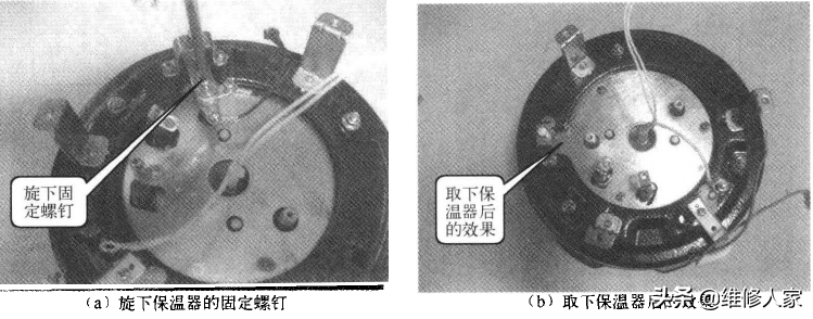 4、双金属片保温器的拆卸主控电路板拆卸后,找到双金属片保温器,用螺钉旋具将保温器的固定螺钉旋下,再取出双金属片保温器即可完成拆卸。