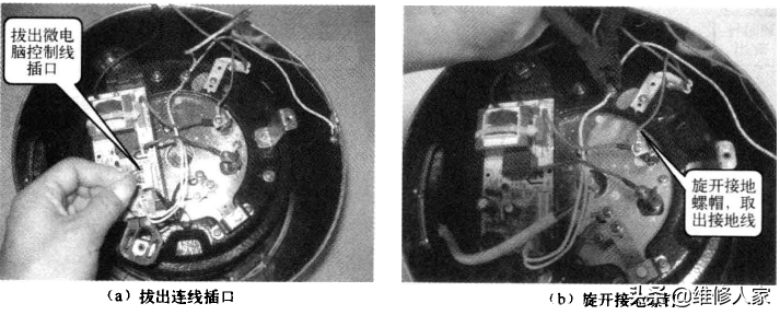 2、锅体的拆卸 电饭煲底座拆除后,就可以进行锅体的拆卸。首先拔出微电脑控制线插口和锅盖启动开关连线插口,再旋下接地螺帽,取出接地线,断开与锅体相连的所有导线。
