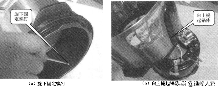 断开与锅体相连的所有导线后,将电饭煲侧翻,找到内锅固定螺钉并将其旋下,再把电饭煲倒立,双手慢慢将锅体往上提起,就可完成锅体的拆卸,如图。