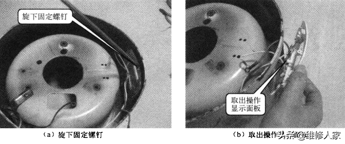 6、按键操作显示面板的拆卸用十字槽螺钉旋具将按键操作显示面板与外壳相连的固定螺钉旋下,就可把按键操作显示面板从外壳中取出,如图。