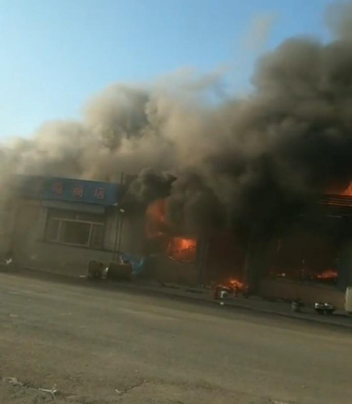 通过市民提供的视频可以看到,起火的家电商店是一栋平房,室内不断有浓烟和明火窜出。随着火势的蔓延,旁边的手机店和服装店也冒起了浓烟,消防指战员正在现场进行扑救。