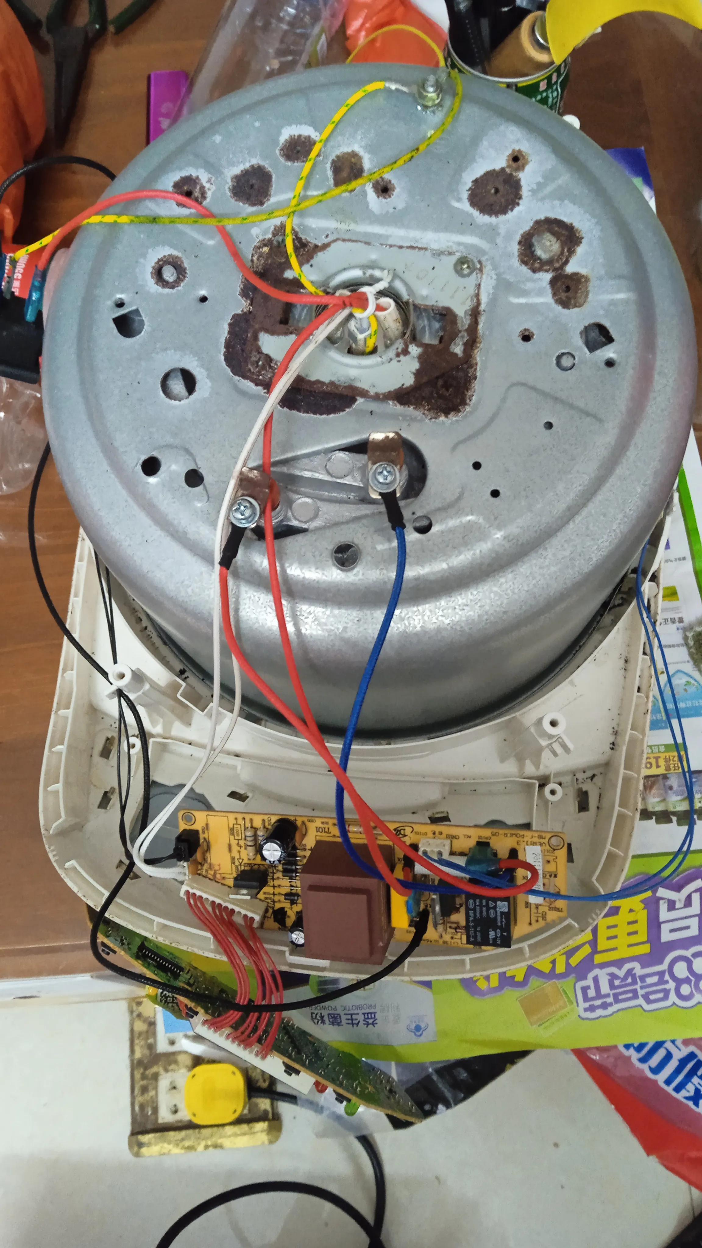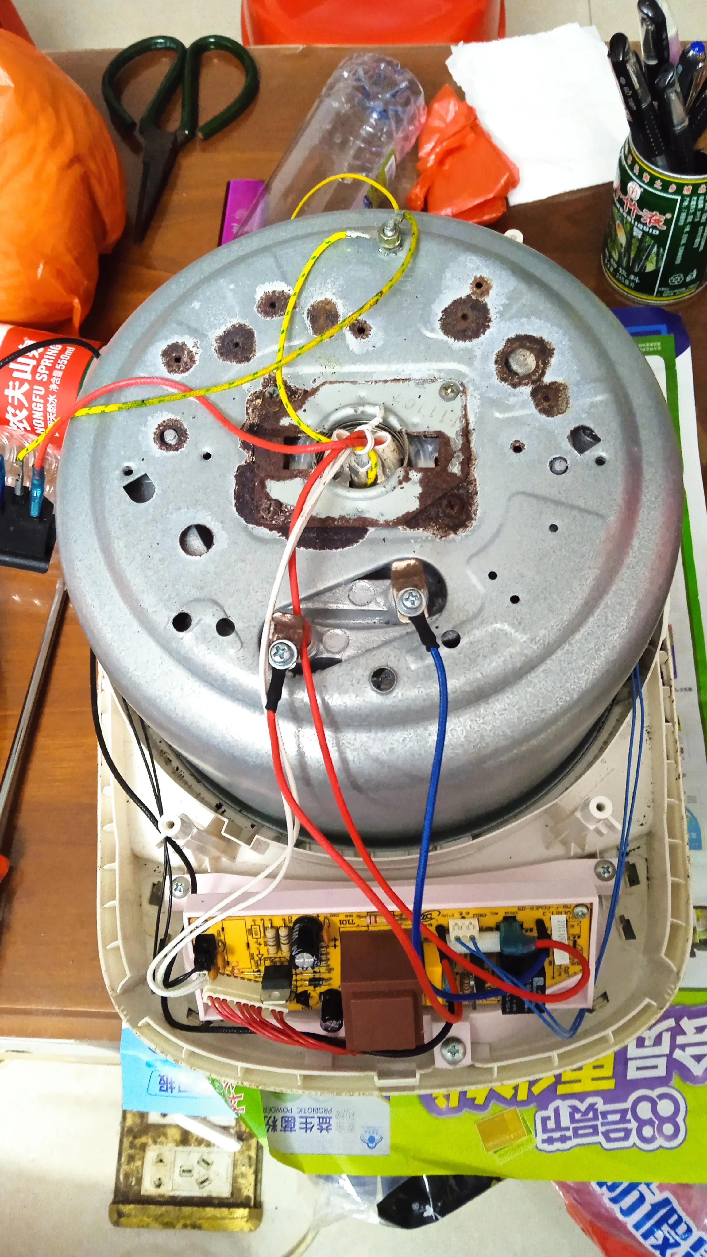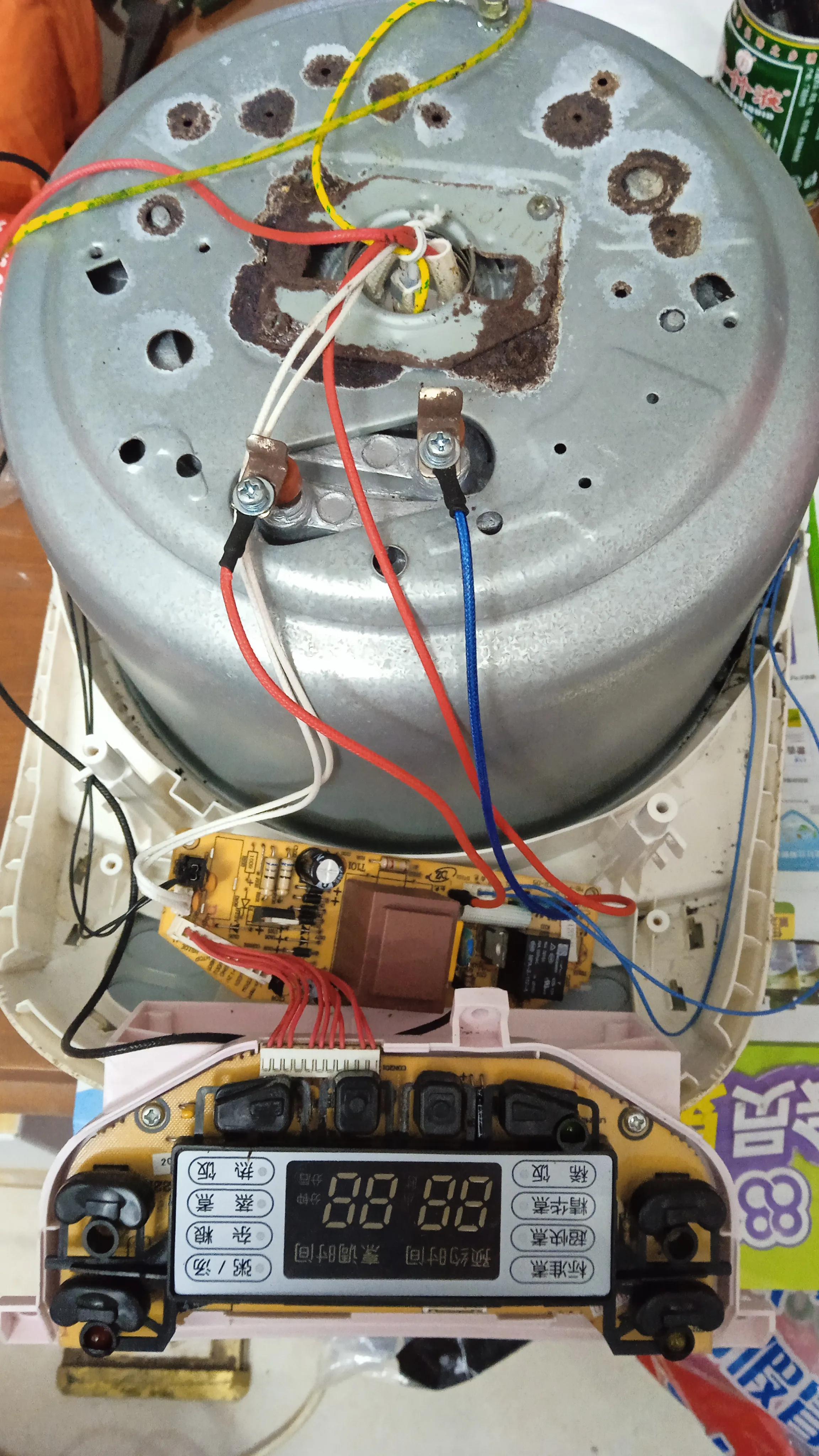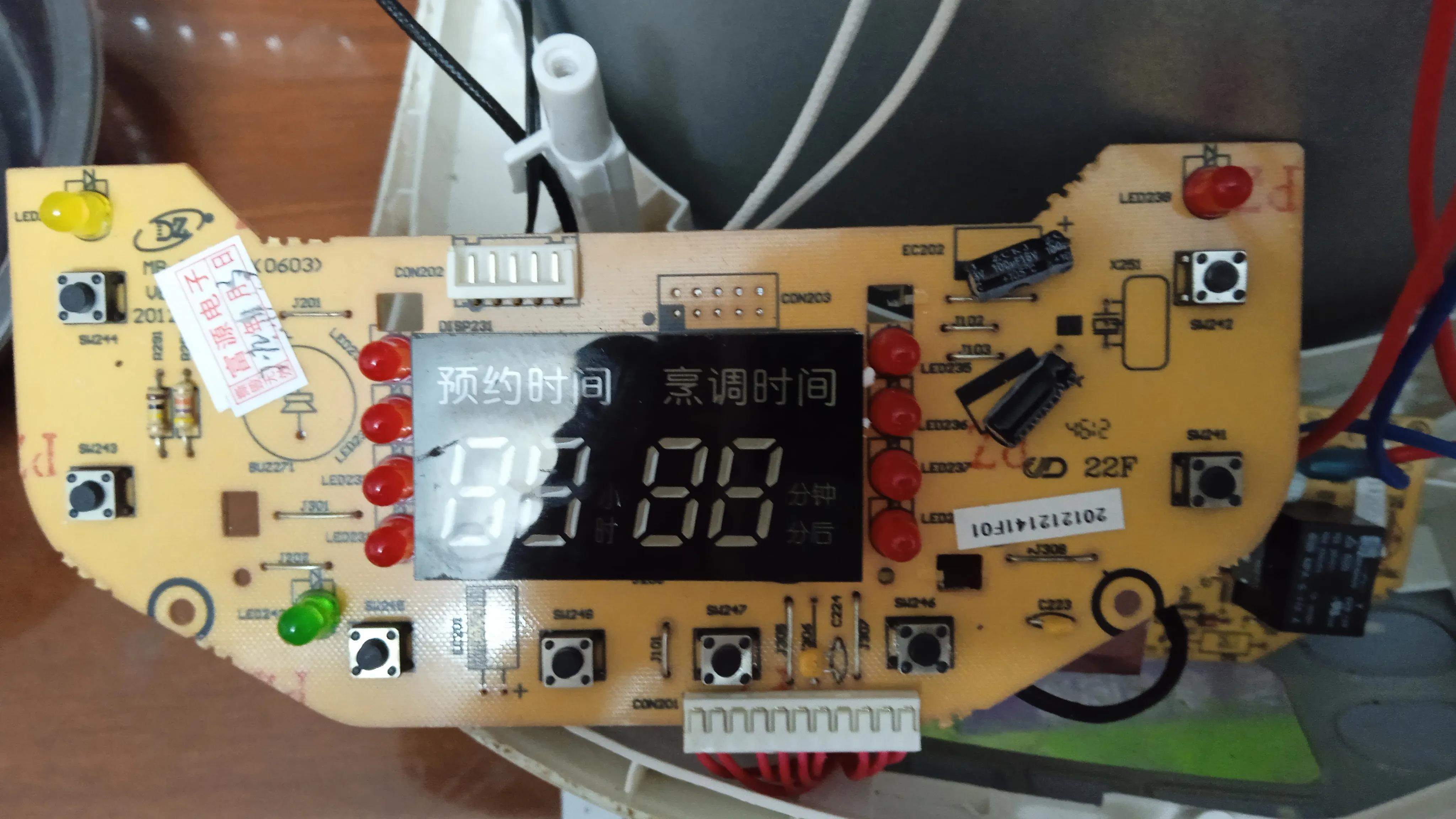 手上没有温度保险丝,暂时用铜丝线短接保险丝,通电检验。电饭煲通电显示正常,各按键也正常。问题就是温度保险丝熔断了。淘宝上定了几个温度保险丝。(不建拿掉温度保险丝,直接短接使用,这样会失去温度过高起到保护作用,比如干烧)