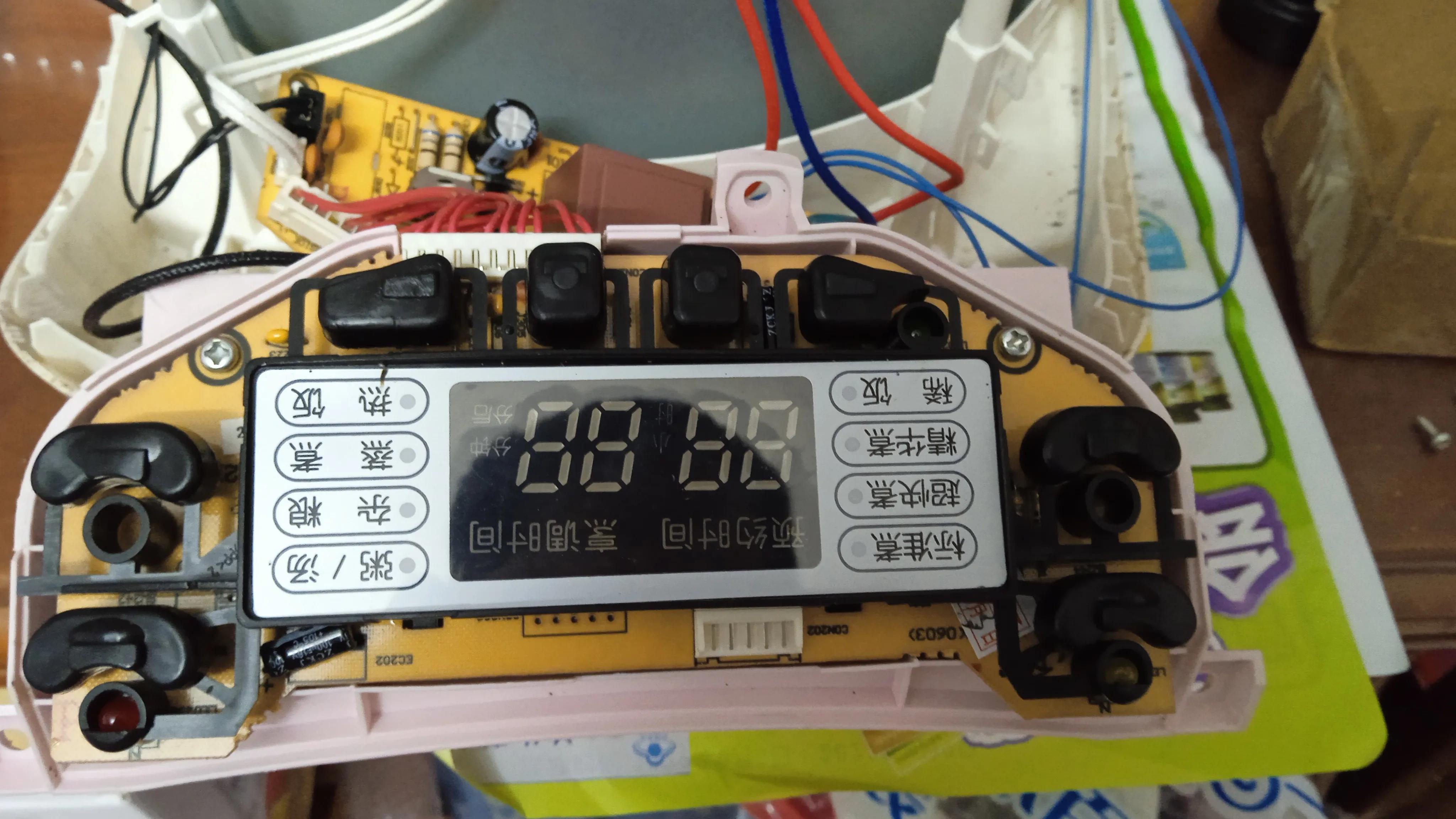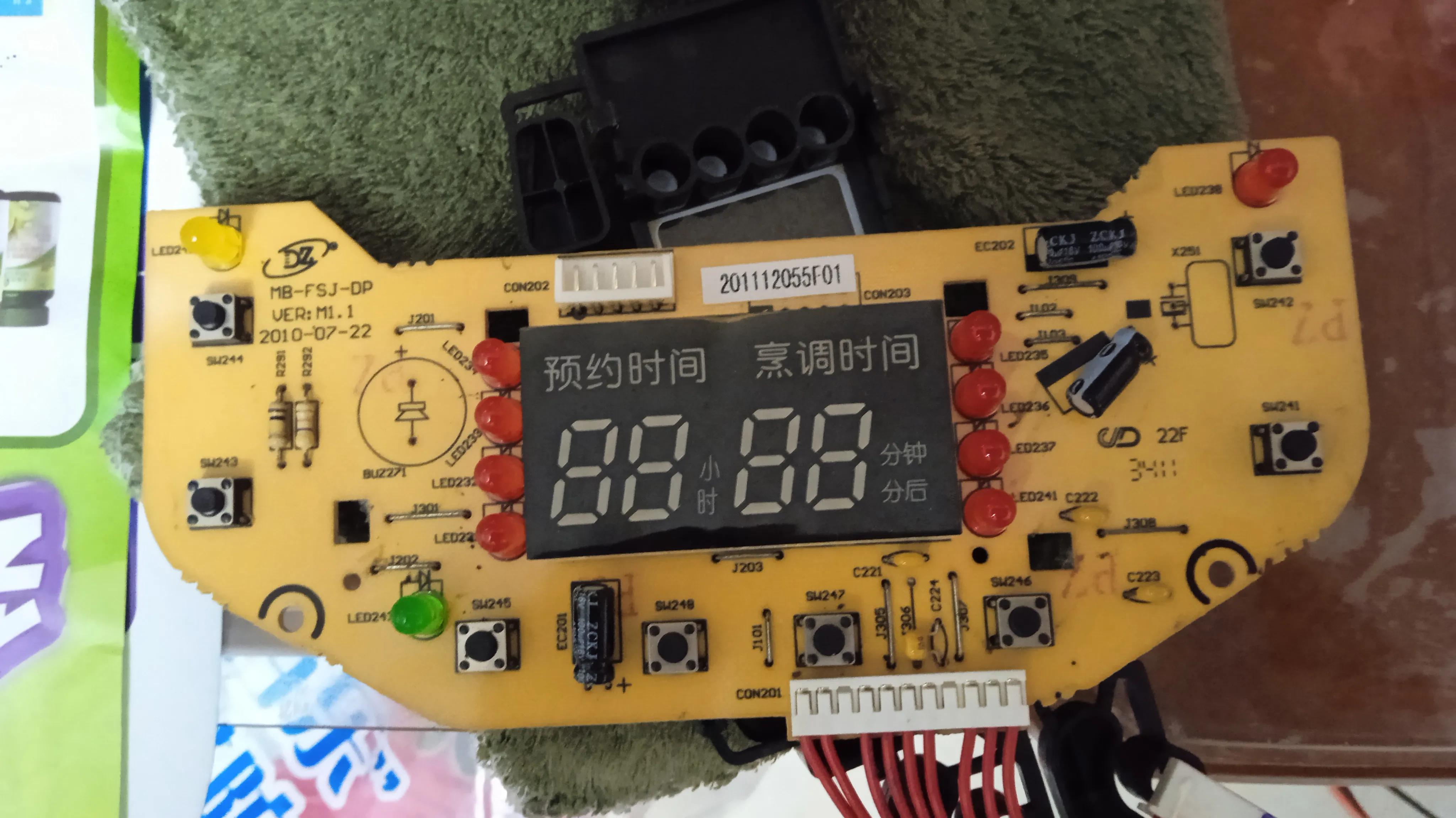 修一台2011年左右产的美的牌智能电饭煲。故障是不定时出现通电按下功能键后显示一排横杆,再按无反应。起初怀疑是按键故障,检查按键正常。根据理论分析有几种可能:1、控制板受潮漏电;2、控制板电容性能不良;3、控制芯片损坏或程序错乱。通过检查基本排除前两种可能,第3种情况几乎无修复可能,果断更换控制板恢复正常。