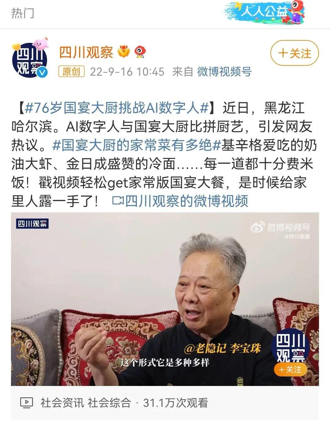 这场特殊的厨艺比拼引发网友热议,得到271家微博媒体转发报道,#76岁国宴大厨挑战AI数字人##国宴大厨的家常菜有多绝#登上了微博热搜,话题总阅读量达7483万。