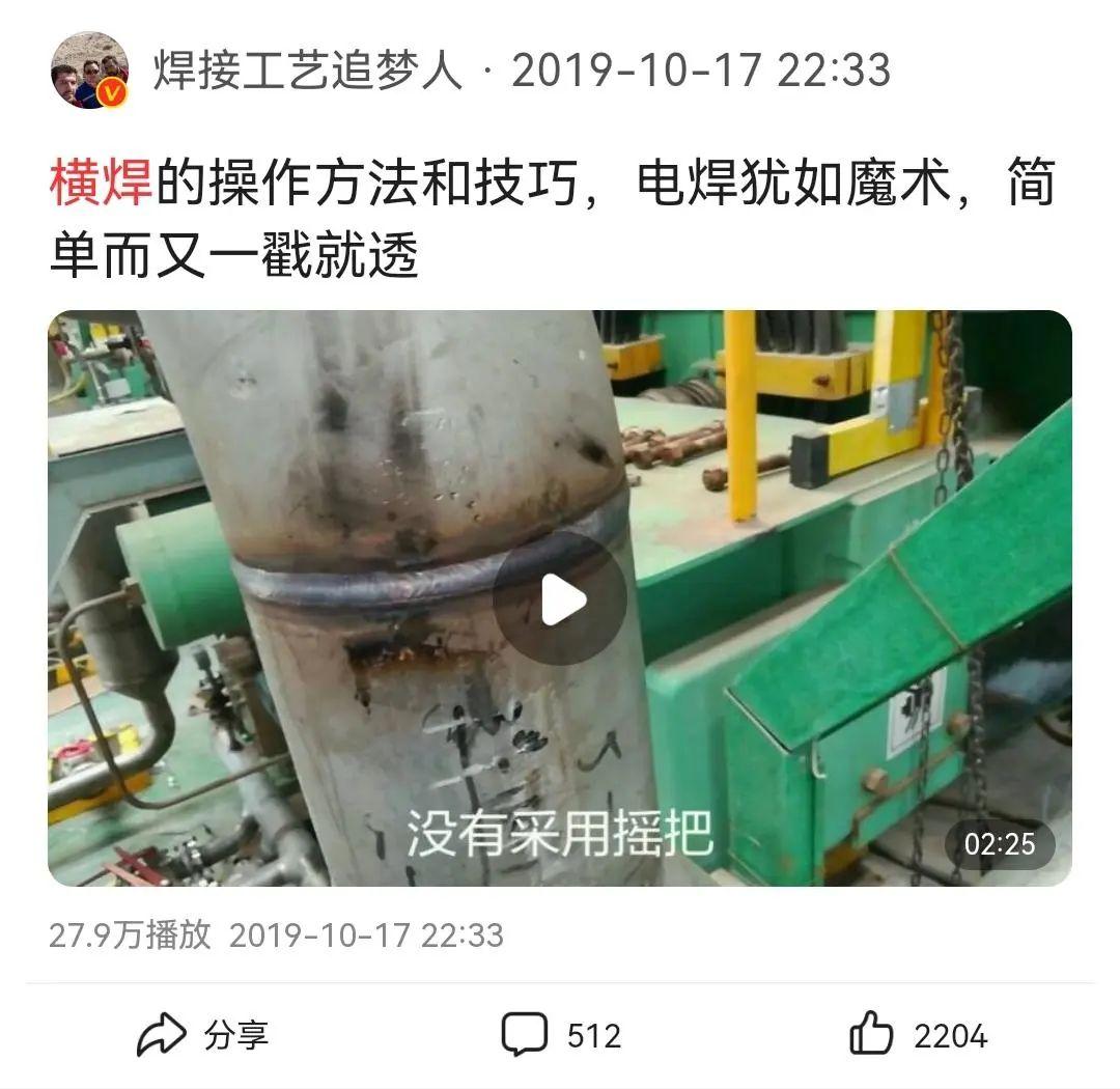 他将拍摄场景换到室外,增加了现场实操画面,比如这条介绍横焊的操作方法和技巧的视频,详细分享了自己的作业思路和细节,播放量达27.9万。