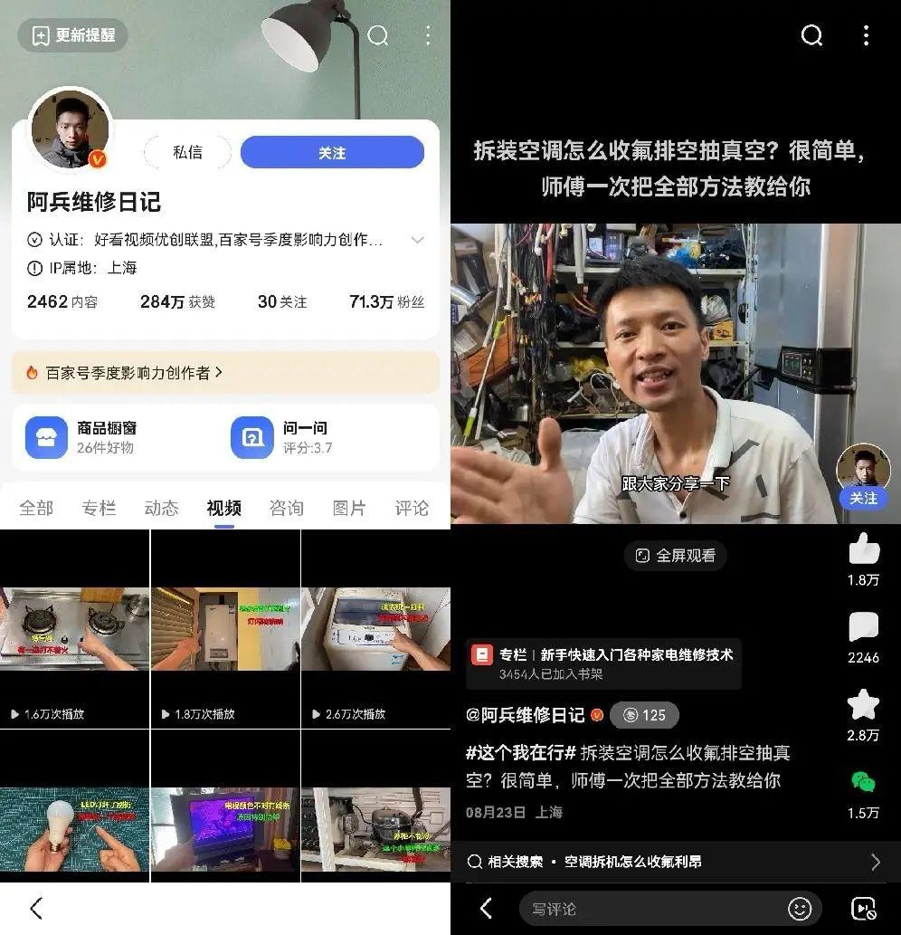 在百度,遇到家电维修问题,可以搜索“阿兵维修日记”,比如拆装空调怎么收氟排空,他的解答有104万次播放;修理LED灯泡的一条视频播放量高达324万。