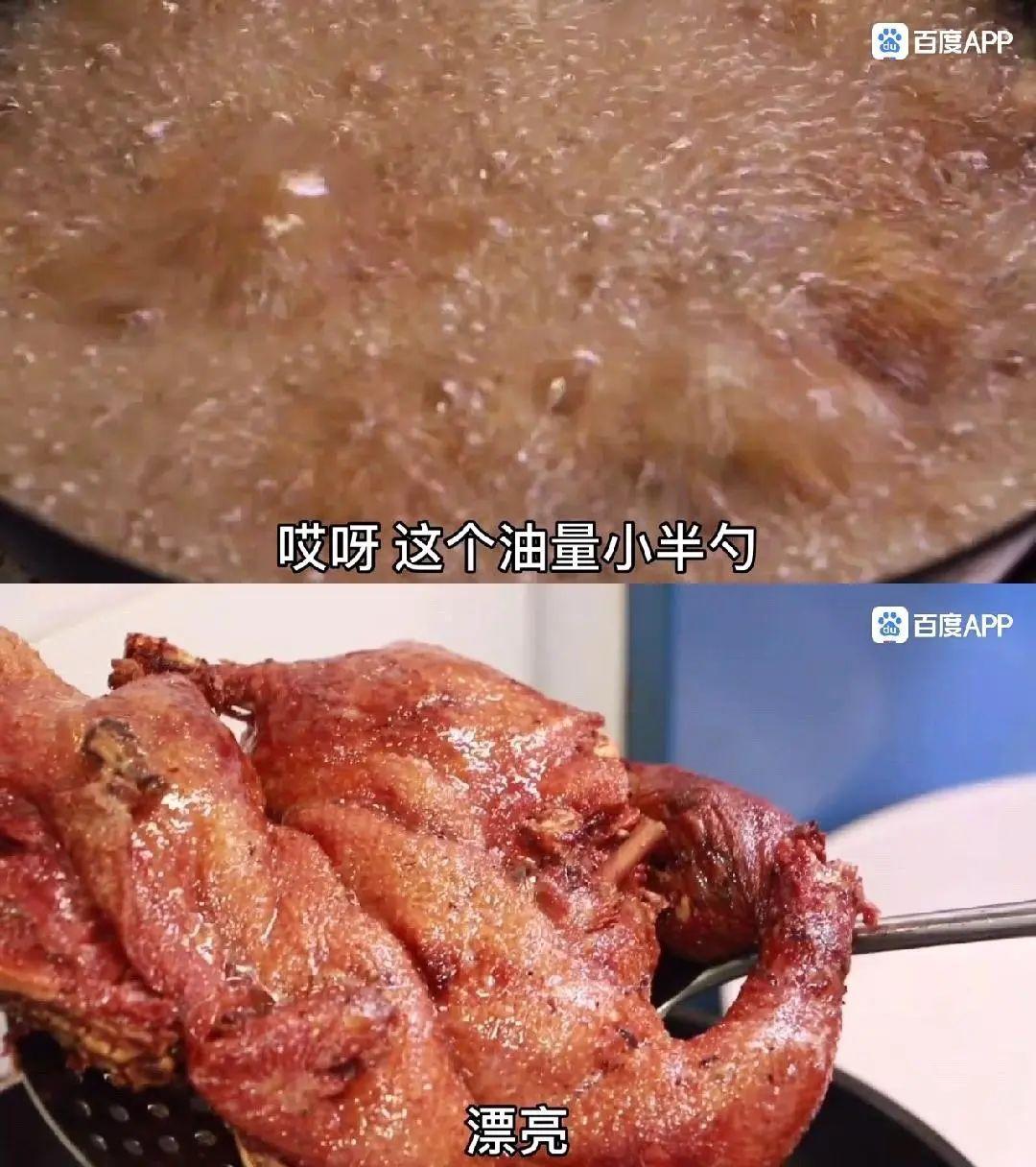 一声“开搞”令下,老隐一一展示了处理鸭子、腌制调味、小火慢蒸、大火油炸的全过程。当中给鸭子按摩时,小隐调侃道“有手牌吗”。更多时候他会在对话中适当补充一些细节,像油量不能放太多,用空气炸锅也可以。