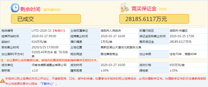 2020年3月27日下午16点,历经20轮竞拍, 位于高新区周山大道与北航路东北角的76亩商住地块,最终被中浩德地产,河南浩德郡澜置业有限公司 以成交价650万元/亩,溢价率5.9%,成交总价约4.97亿元成交额,成功拿下。