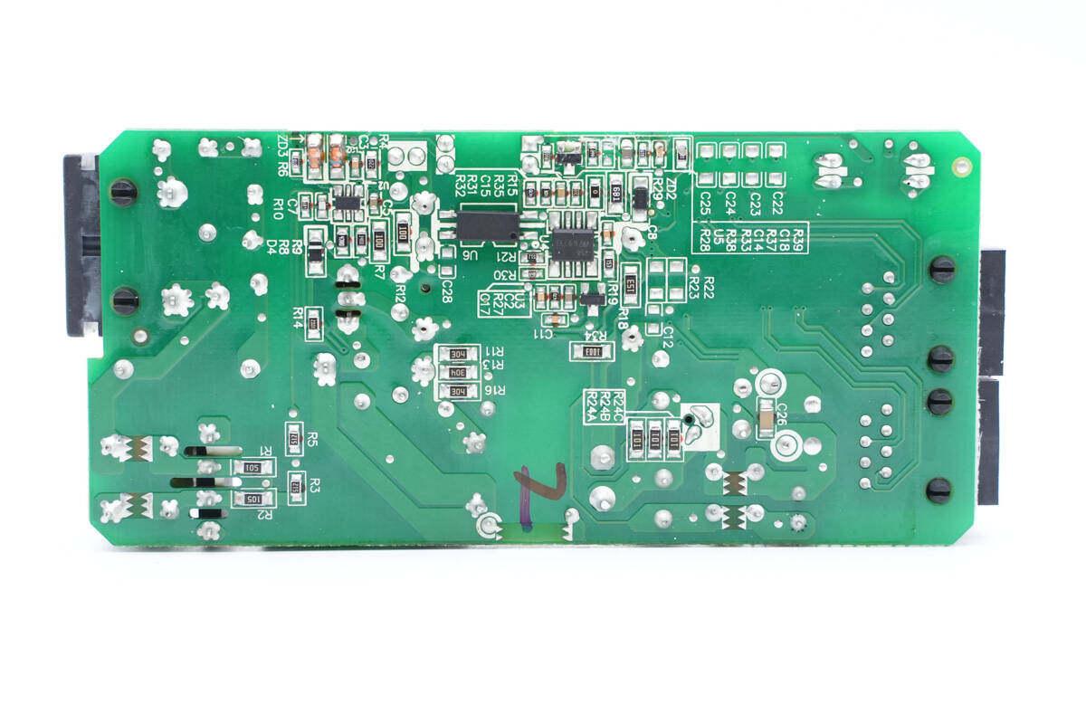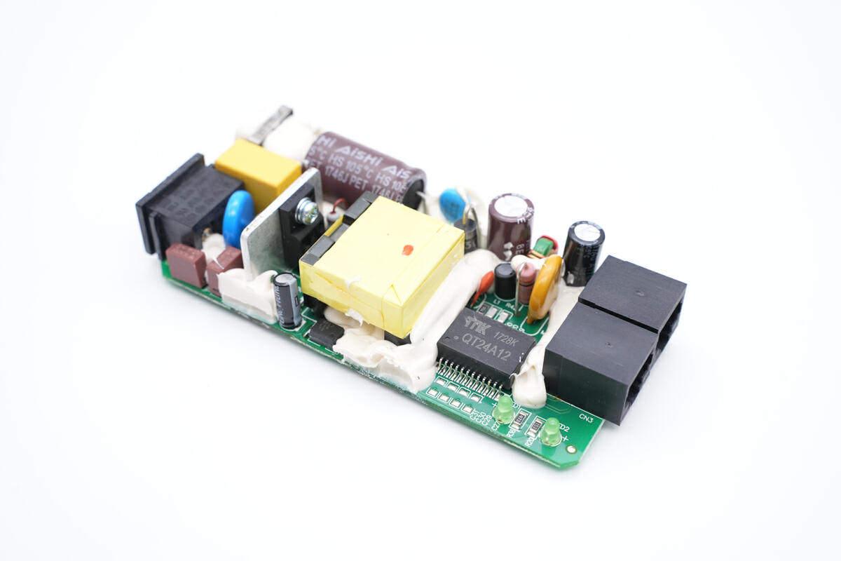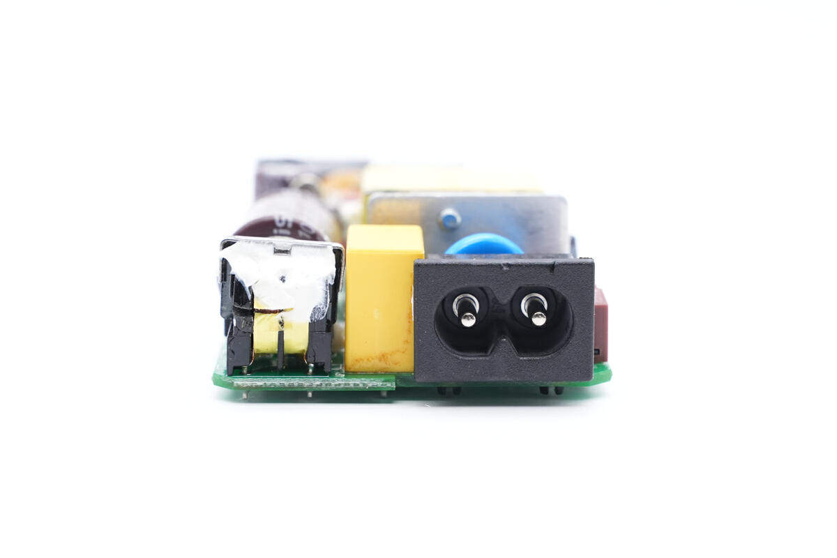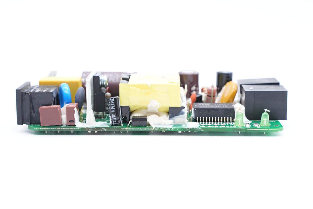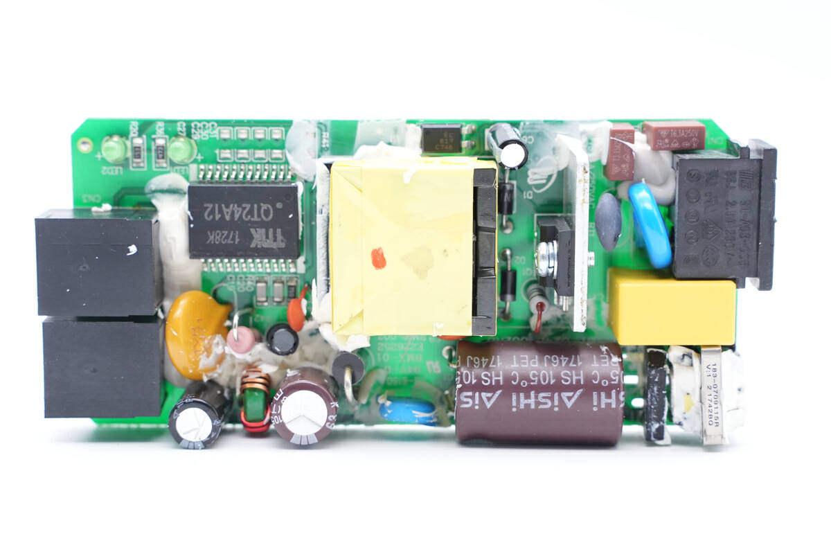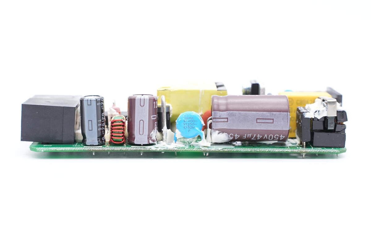 PCBA模块正面一览,右上角为交流输入端,焊接保险丝,压敏电阻,NTC热敏电阻,安规X2电容,共模电感,整流桥,高压滤波电容。在高压滤波电容上方是初级开关管,左侧是开关变压器。右侧焊接网口插座,网络变压器以及滤波电容和电感。