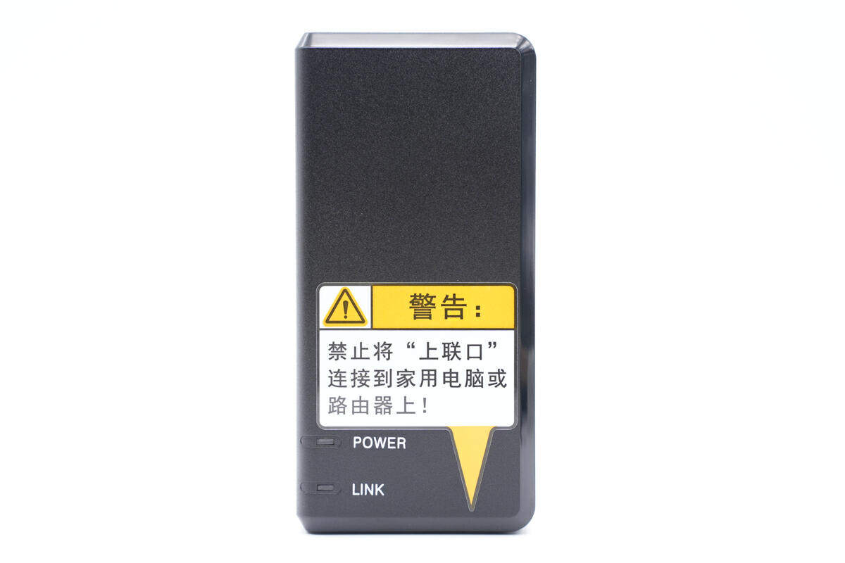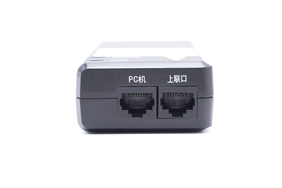 另一端设有两个网线插口,插口旁分别印有PC机和上联口提示。