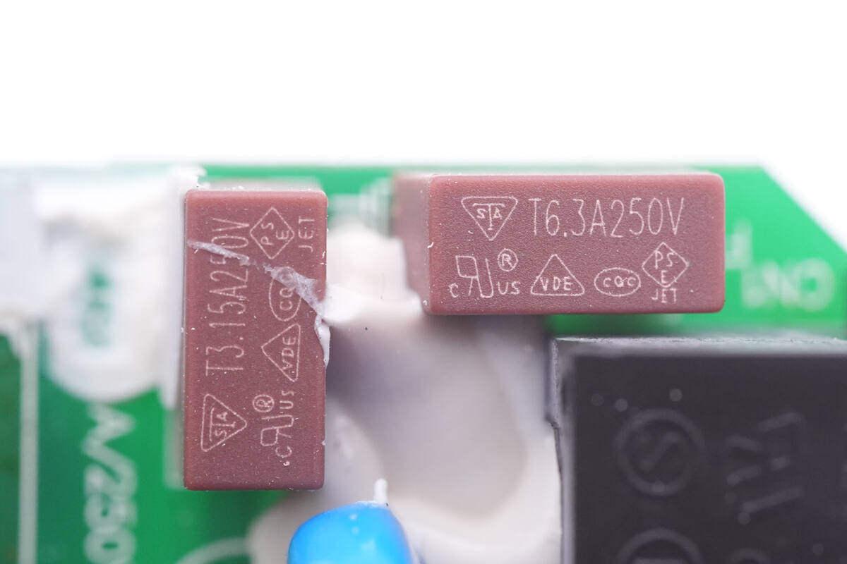输入端焊接两颗保险丝,其中一颗规格为3.15A,另一颗规格为6.3A。