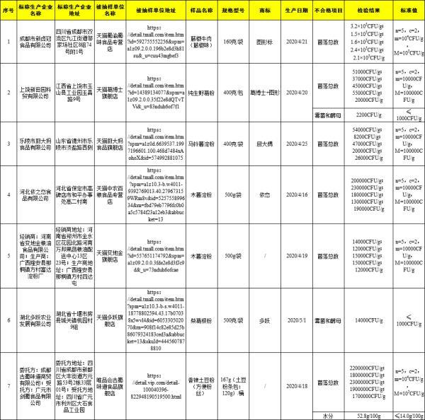 (三)天猫厨大妈食品旗舰店(经营者为北京厨大妈食品集团有限公司)在天猫(网店)销售的、标称山东省德州市乐陵市厨大妈食品有限公司生产的马铃薯淀粉,菌落总数不符合食品安全国家标准规定。