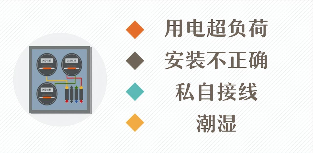 引起电表箱起火的原因很多:如用电超负荷、潮湿、安装不正确、私自在电表上接线等,特别是雨水较多的季节和夏天用电量超负荷都可能引起电表箱起火 。除此之外,一些居民楼内住户私自在电表箱周围堆放的杂物、旧家具等易燃品,也会存在安全隐患。