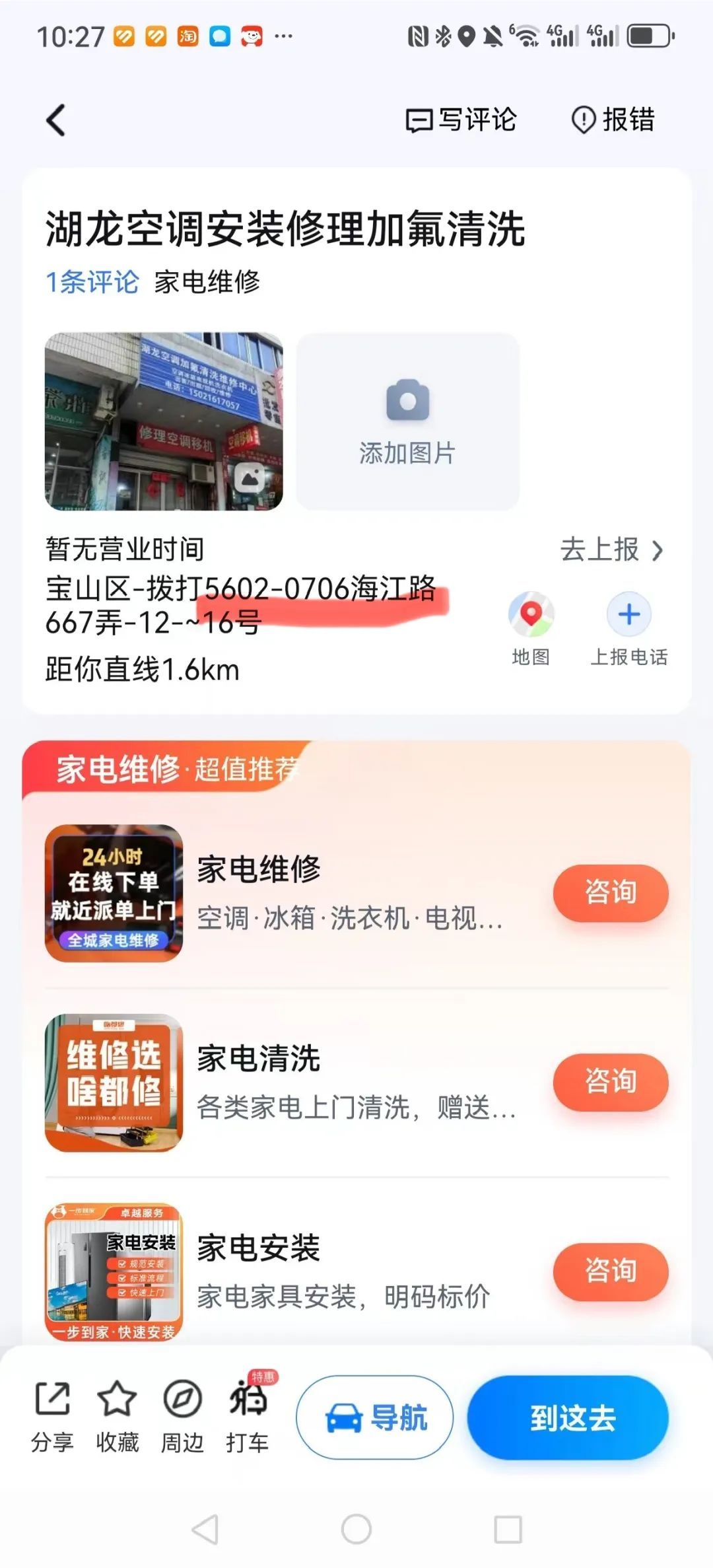 百度地图搜索排名第一的“上海宝冶家电维修中心”及排名第三的“湖龙空调安装修理加氟清洗”实地也无法找到。同时亦有显示地址不同,固定电话却相同的情况(见下图)。