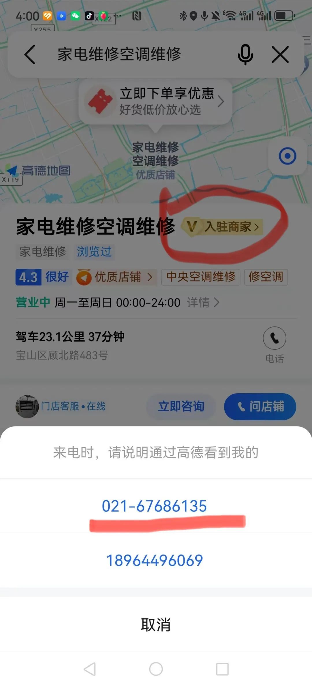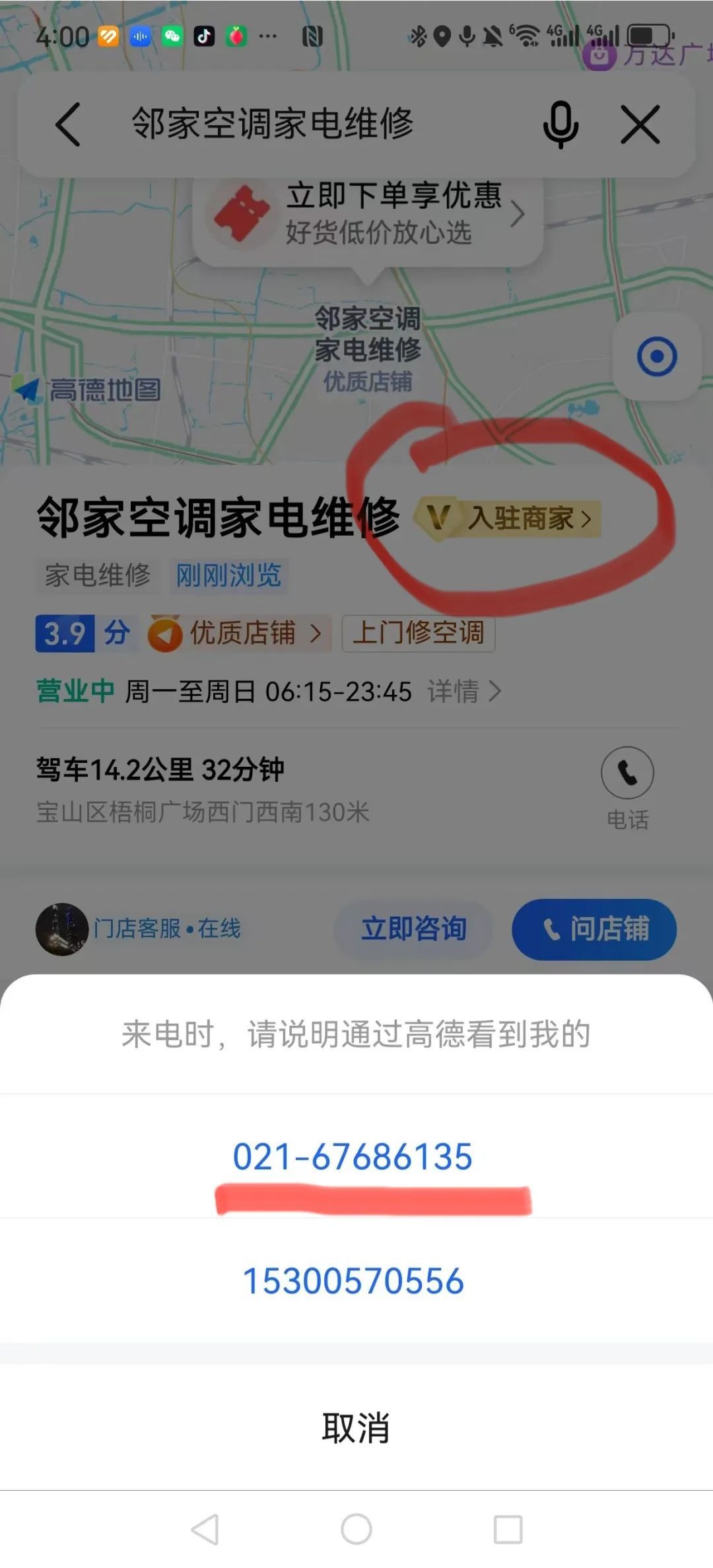 值得注意的是,高德地图搜索排名前三的“家电维修空调维修”“邻家空调家电维修”及“闪闪到家•家电维修服务中心(长江南路店)”均为“加V入驻商家、优质店铺”,然而实地探查发现三家地址显示均为虚假,致电客服也拒绝提供真实地址,且三家中有两家固定电话相同显示地址却不同(见下图)。