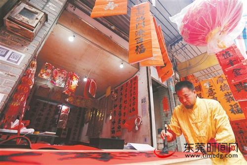 石龙人很重视对联,街道里石龙本地人小陈在帮人写对联,按大小收费,1.6米的20元,1.8米的28元,2.5米的50元。林立尚告诉记者,这里还有位80多岁写对联的老师傅,每年这个时候都会出摊帮街坊写对联,在旧街无人不晓,几十年练就的技艺。