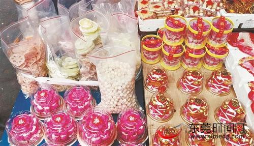 街边的阿姨摆摊卖起了“年花”,是春节时祭神的供品,被做成了“蛋糕”的样子,加上精致小巧的“寿桃”饼等,吸引了众多街坊停下来购买。