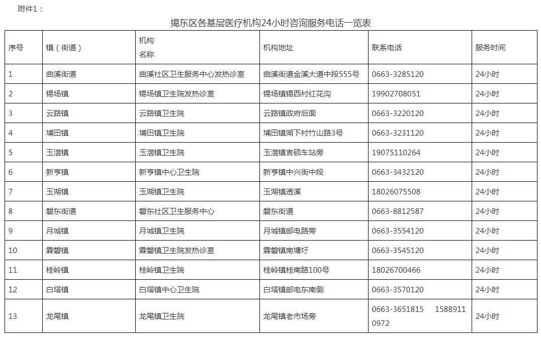附件:1、揭东区各基层医疗机构24小时咨询服务电话一览表