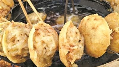 谢国振说,制作灯盏粄时,需准备好平底铁勺,首先将苏打粉和粘米粉调成糊状的米浆,米浆不能太稠,以带点水为宜,然后将白萝卜丝、葱、辣椒、盐、五香粉等调味后拌匀作为馅料。油炸前,先把一部分米浆倒在平底铁勺上作为底面,米浆不宜放太多,然后将白萝卜丝等馅料放入铁勺中,摆放成“小山”状,顶部要覆盖饱满,以平底铁勺边上不露出馅料为宜。最后,倒入一层米浆盖住馅料,一并放入花生油,在油锅中油炸四五分钟,即成色香味美的连平灯盏粄。