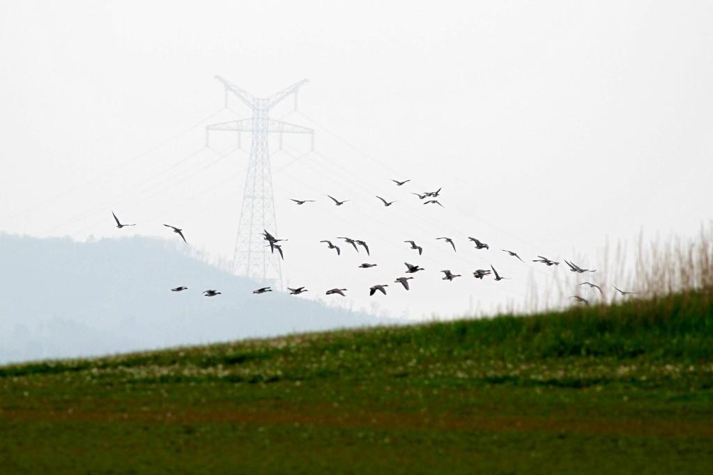 2013年雨水节气过后,一群大雁在江西鄱阳湖湿地集结,准备北迁。
