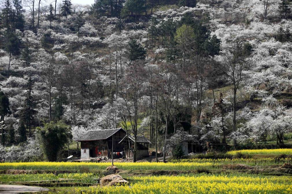2009年雨水节气后,贵州贵定县盘江镇境内的万亩李花盛开,与油菜花田构成一幅美丽的图画。