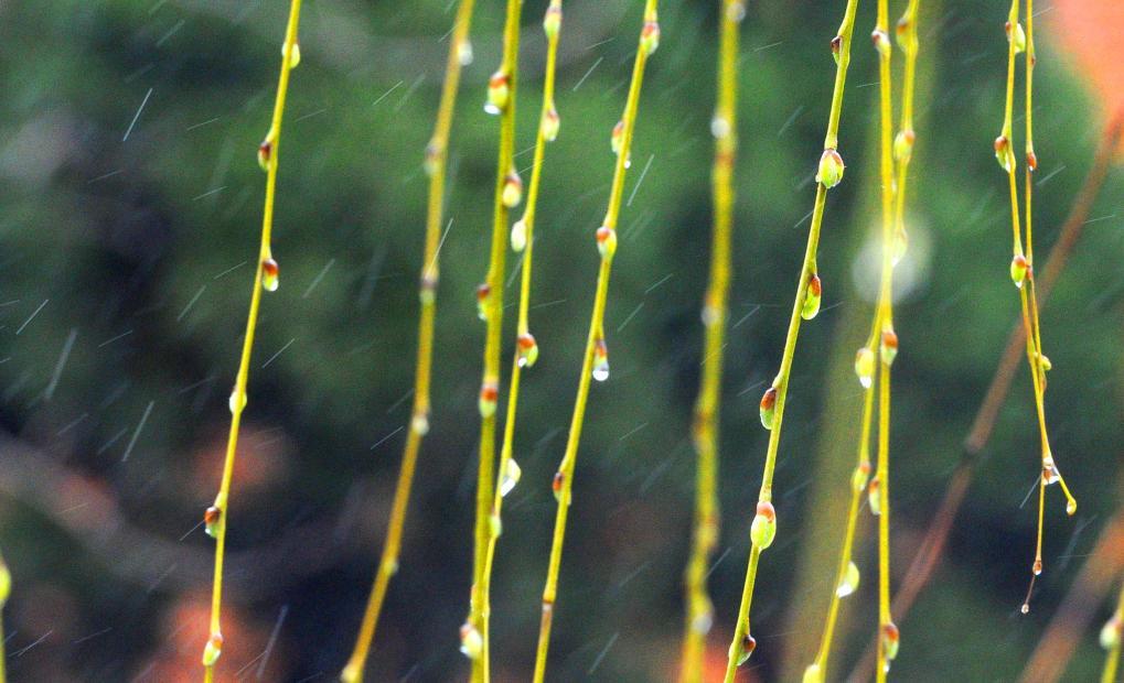 2013年雨水时节,苏州街头柳枝上爆出的嫩芽在绵绵春雨中。
