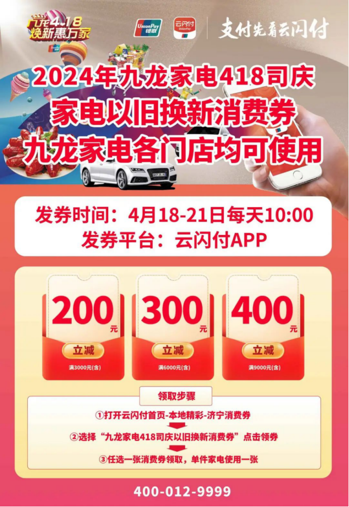 九龙家电自成立以来,致力于为广大消费者提供高品质的家电产品。值此31周年之际,在济宁市商务局的支持下,联合云闪付推出以旧换新消费券活动,本次活动不仅是感谢大家对九龙家电一直以来的支持与信任,更是为了给大家提供更加美好的焕新生活体验。