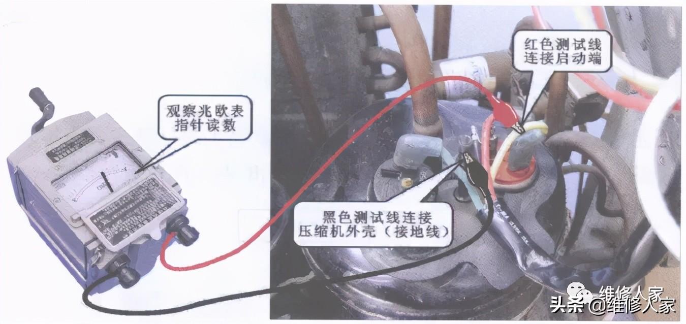 空调器出现漏电的情况,首先应检査空调器中无绝缘的通电金属部件对地电 阻是否高于1M。如果通电金属部件的对地电阻高于1M,则空调器可安全使 用;如果通电金属部件的对地电阻低于1M,需检査空调器电气线路每一段的 绝缘电阻是否正常。下图所示为检査空调的对地电阻值。