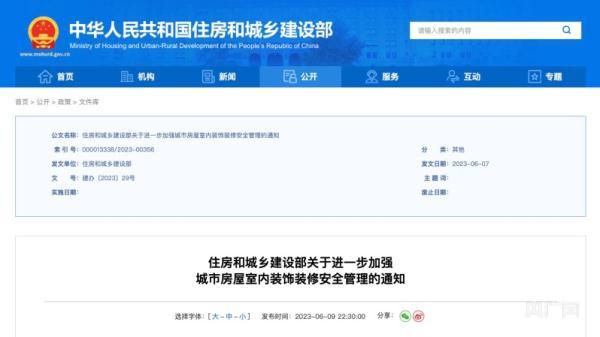 住房和城乡建设部发布《关于进一步加强城市房屋室内装饰装修安全管理的通知》
