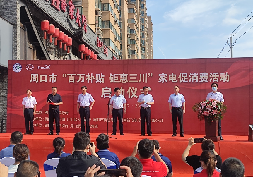 2022年7月23日上午,周口市“百万补贴 钜惠三川”家电促消费活动启动仪式在川汇区新达电器门前广场启动。