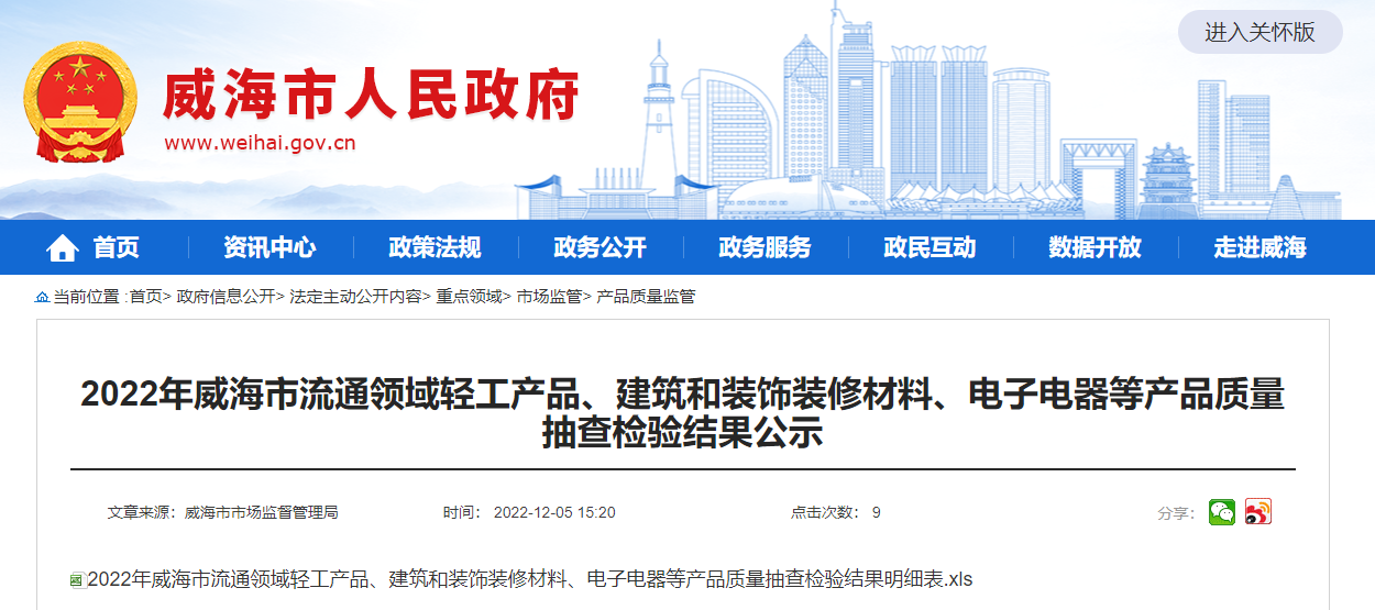 山东省威海市公示2022年流通领域轻工产品、建筑和装饰装修材料、电子电器等产品质量抽查检验结果