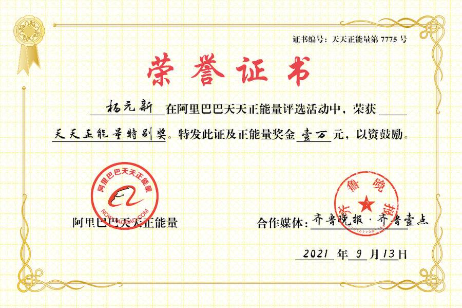 天天正能量是阿里巴巴集团联合齐鲁晚报在内的全国100多家主流媒体共同打造的大型公益平台,旨在通过奖励平凡人的善行义举、组织开展创新公益活动,唤醒和改变人心,推动社会向善向上。截至目前,天天正能量总计投入公益金8600多万元,直接奖励人数达9000多人。此前齐鲁晚报·齐鲁壹点报道的给老人撑伞的济宁医生吴静、跳海救女童的62岁烟台大叔董远航、开车送淋雨奶奶回家的乳山小伙胡金浩、隔空给济南老人点外卖的四川小伙汤元龙、狂奔给摔倒老人做缓冲的潍坊女子于梅等均曾获得该奖项。