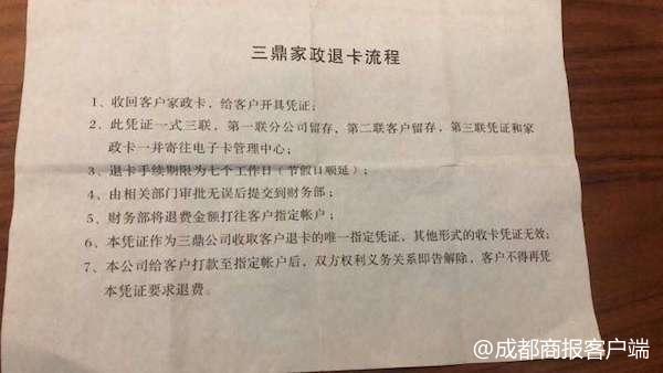 成都商报记者就上述问题致电询问了成都三鼎家政服务有限公司。工作人员表示,今年3到5月办理退卡手续的消费者,会在6月左右由总部统一打款。