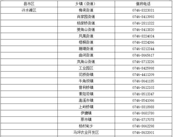 永州市冷水滩区乡镇(街道)值班电话