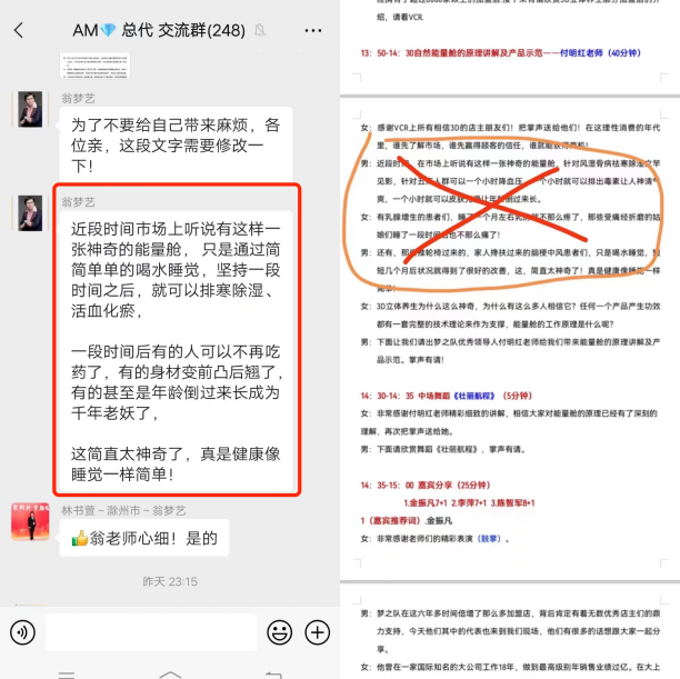 此外,江苏梦之队董事长翁梦艺在江苏梦之队“AM总代交流群”里曾要求加盟商宣传3D能量舱的“神奇效果”。对此,董建明回应中国质量新闻网时,仍坚称其不存在任何涉及疾病治疗的内容。