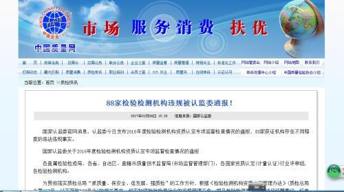 2016年3月8日,中国国家认证认可监督管理委员会(以下简称“国家认监委”)在其官网发布了国家认监委关于2016年度检验检测机构资质认定专项监督检查情况的通报,公布了251家获证检验检测机构的检查结果,其中88家获证机构存在不同程度的违法违规事实,包括生物医疗领域相关机构有襄阳市疾病预防控制中心、农业部转基因生物食用安全监督检验测试中心、重庆市江津区疾病预防控制中心、阜康市疾病预防控制中心、广州金域医学检验中心有限公司。