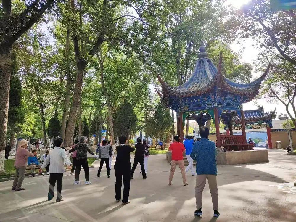 人民路万盛公园里,绿意盎然,市民们或散步或休憩、娱乐。