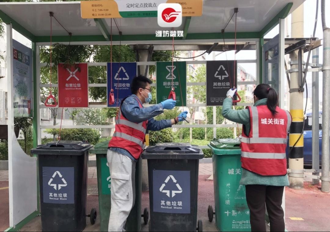 在潍城区城关街道十笏园社区,社区工作人员正在清洁整理垃圾箱。