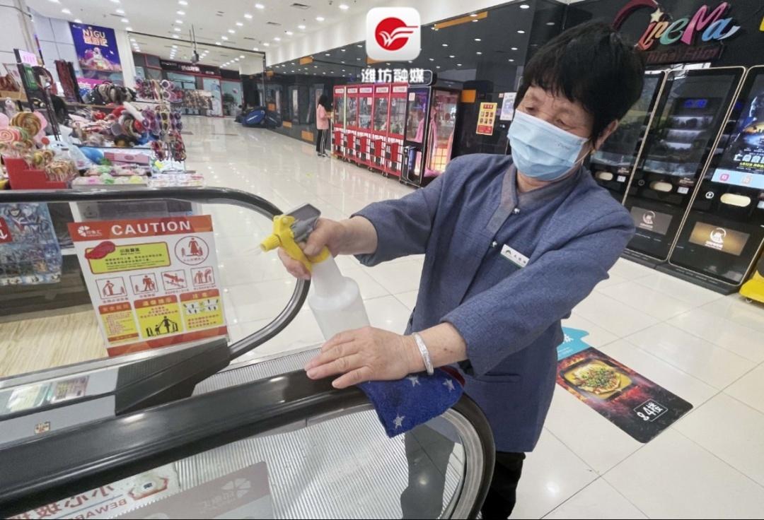 在城区新华路与东风东街交叉口附近一家商场,保洁员毕丽影正在清洁卫生。