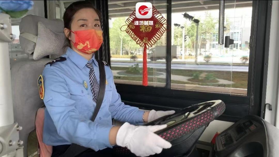 潍坊公交集团26路公交驾驶员王雪萍正在等待乘客上车。