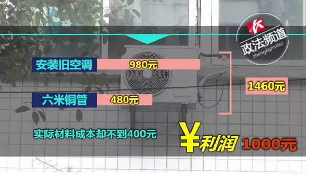 事后,张某算了一笔账,安装旧空调收费980元,另外6米铜管加收480元,一共收费1460元,但实际材料成本却不到400元,仅这一单便有超过1000元的利润。