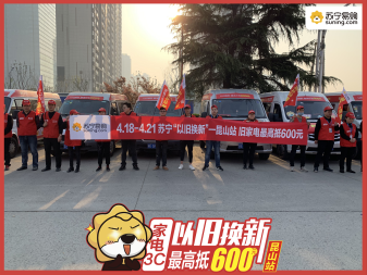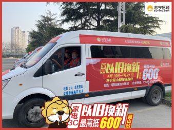 在整个活动中,苏州苏宁统一车辆,整个车由宣传海报包裹,让当地人可以看到、了解以旧换新活动,这些物流专车都是为"上门托运"做准备的,也就是说消费者无需支付额外的拆机、移机、搬运等费用,旧家电都由苏宁专业售后人员免费上门拆卸、送货。另外,针对买新机或买家电去一趟县城交通成本高,苏宁包车带全村用户去买家电。