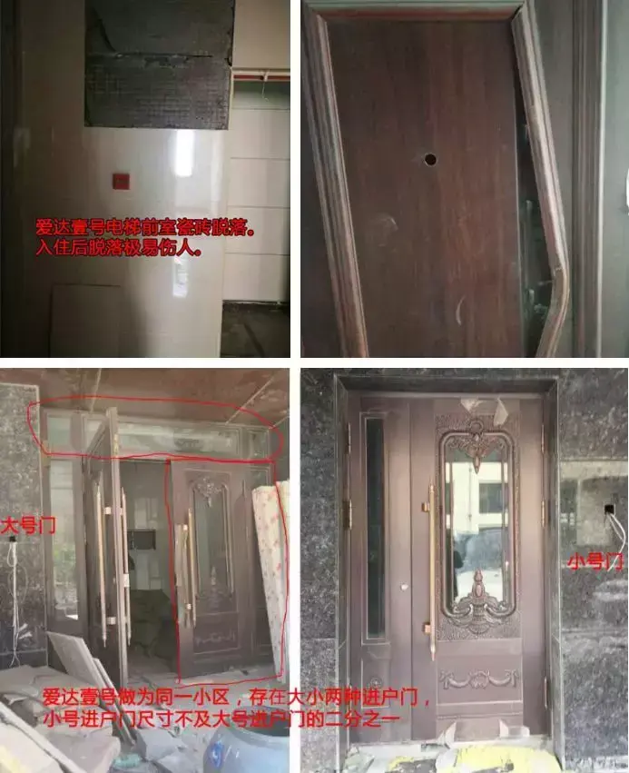 下水管道和烟道附近防火材料缺失、电梯前室瓷砖脱落、外墙普遍存在大面积水渍与脱色、入户门变形开裂、小区内存在大小两种尺寸的单元入户门,A14栋和A15栋的入户门尺寸为2.8米宽,其他楼栋的入户门则仅有1.5米宽……像陈先生一样,爱达壹号的业主们陆续发现了更多的问题。
