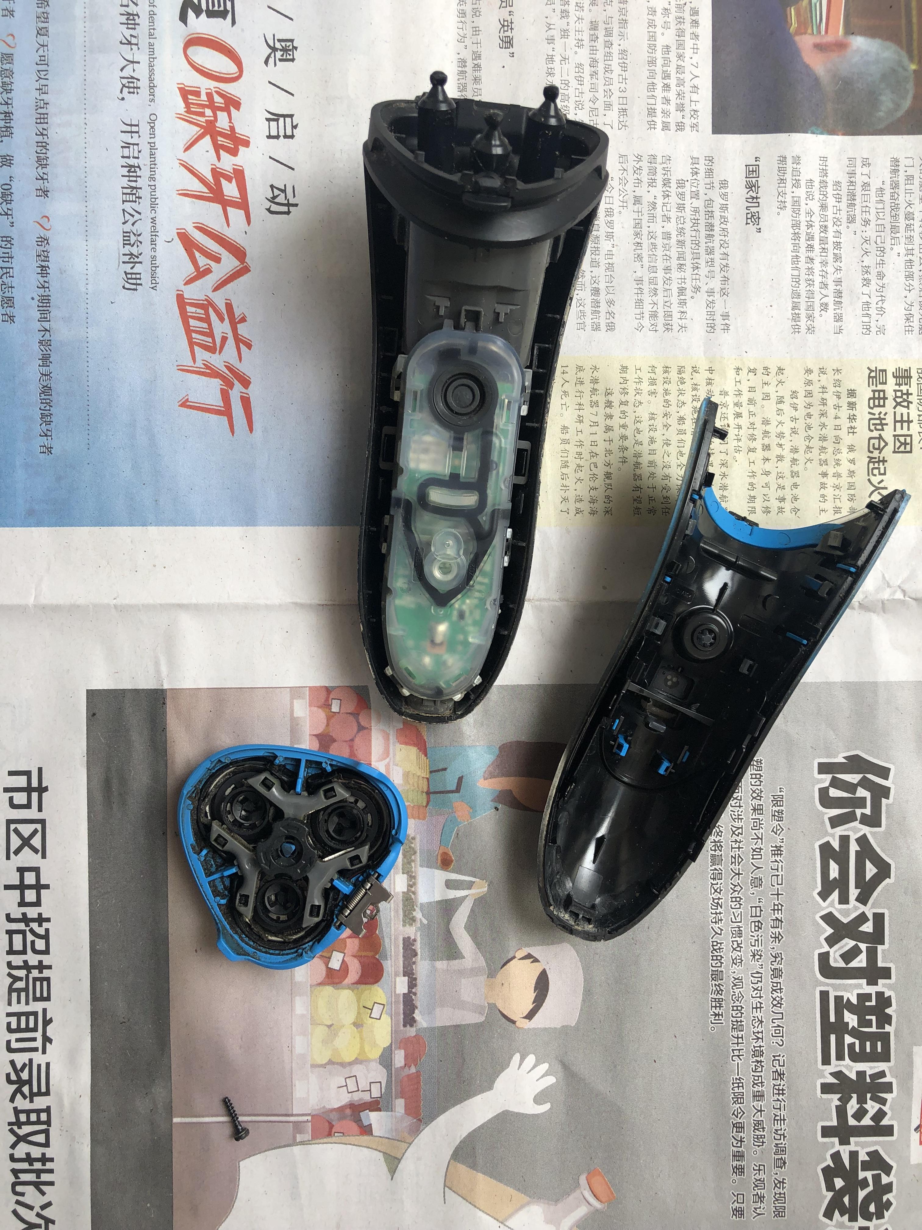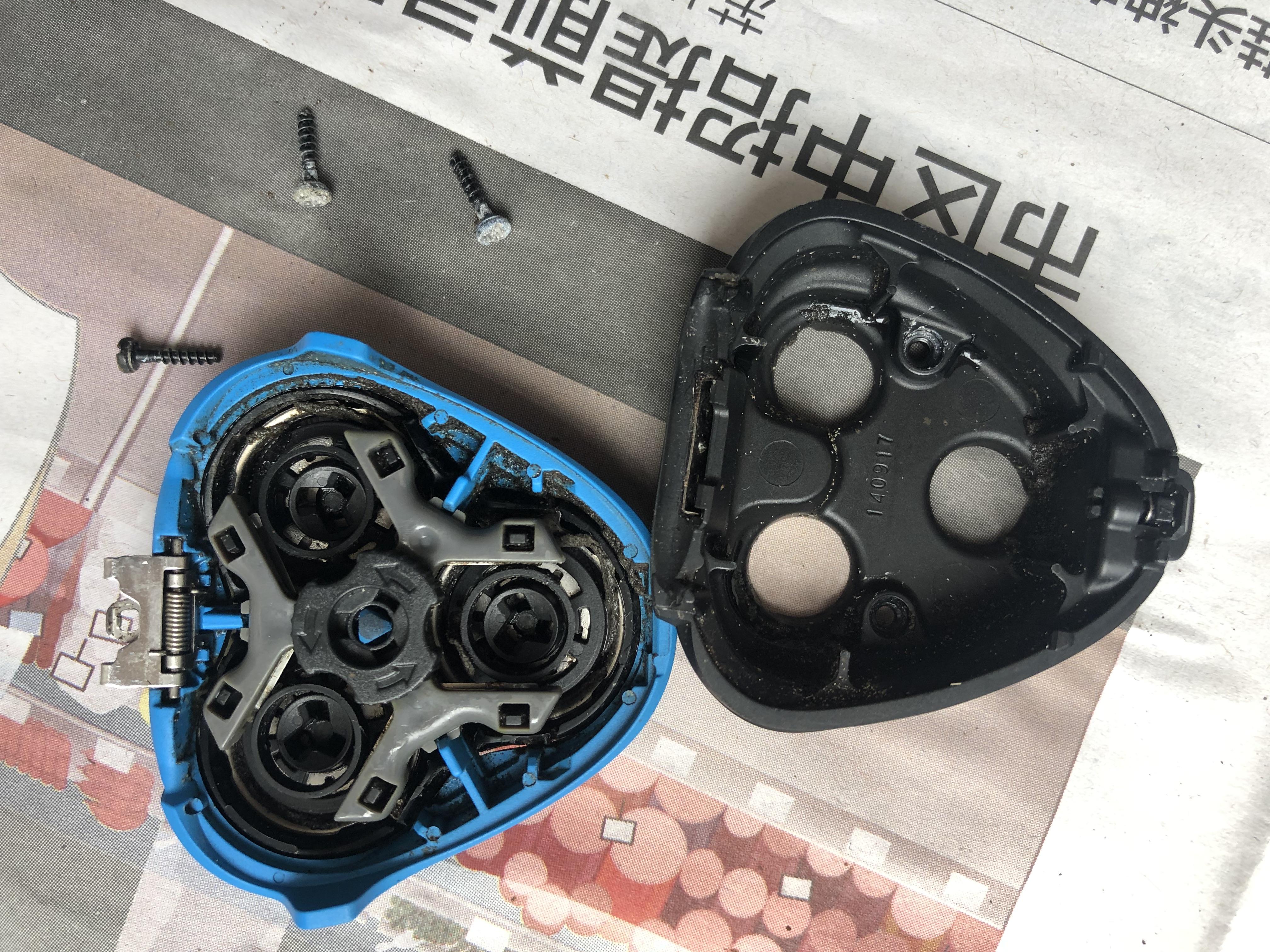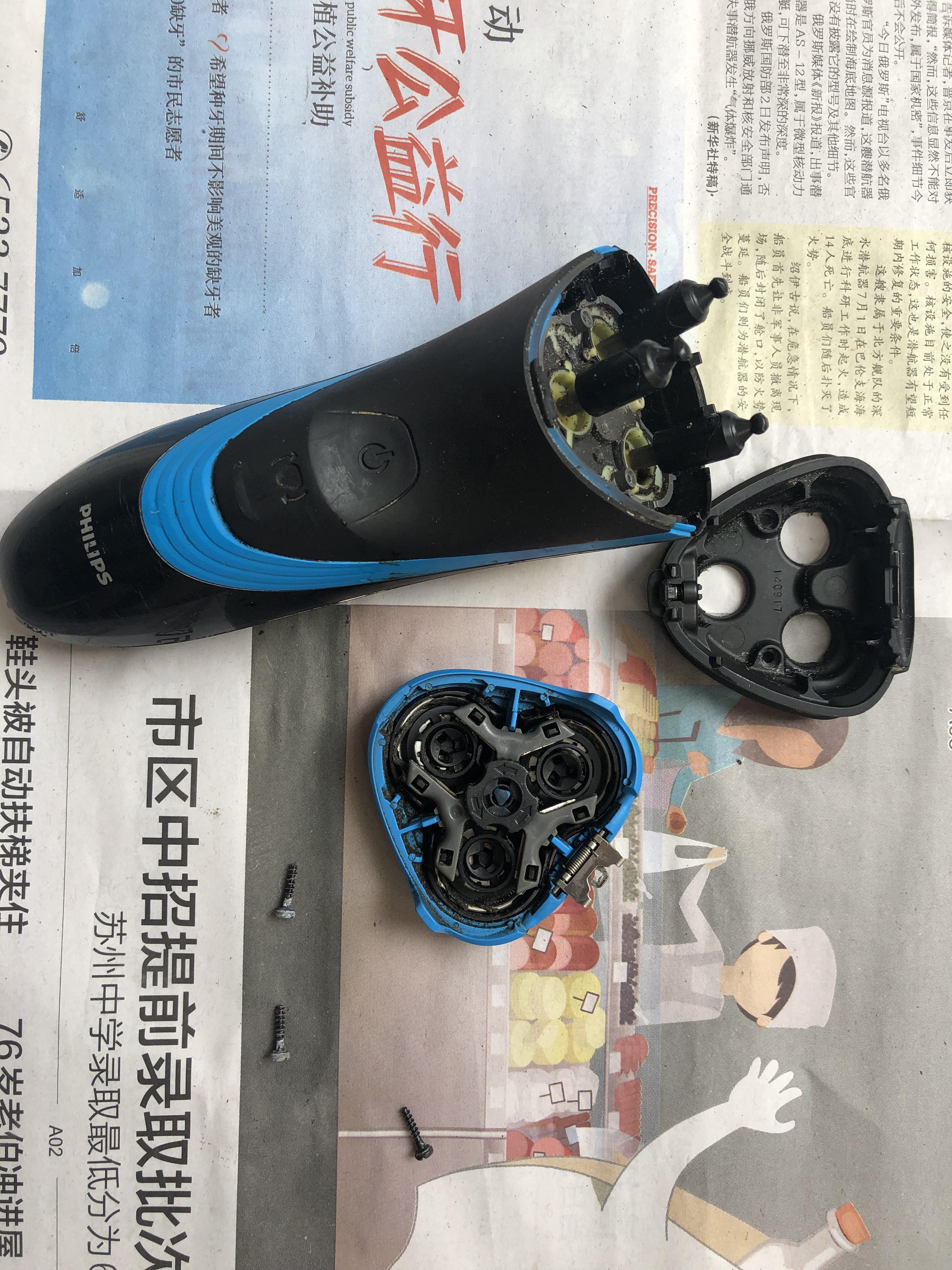 飞利浦剃须刀结构严密,但不是十分复杂,和钟表不能比。拆下需要小心,不要硬撬,找到卡扣,一步步拆解。一般先拆掉头部,里面有两个小螺丝;接下来拆掉背板的一个小螺丝,用钟表起子拨开夹板,慢慢分开;里面的机芯上面有一层塑料的防水套,透明的防水套也是靠卡扣固定,慢慢拉开就可以分解。经过上述的拆解和清理吹干后,剃须刀复原,运转正常,听到匀速的声音,太开心了,可以继续“服役”了。