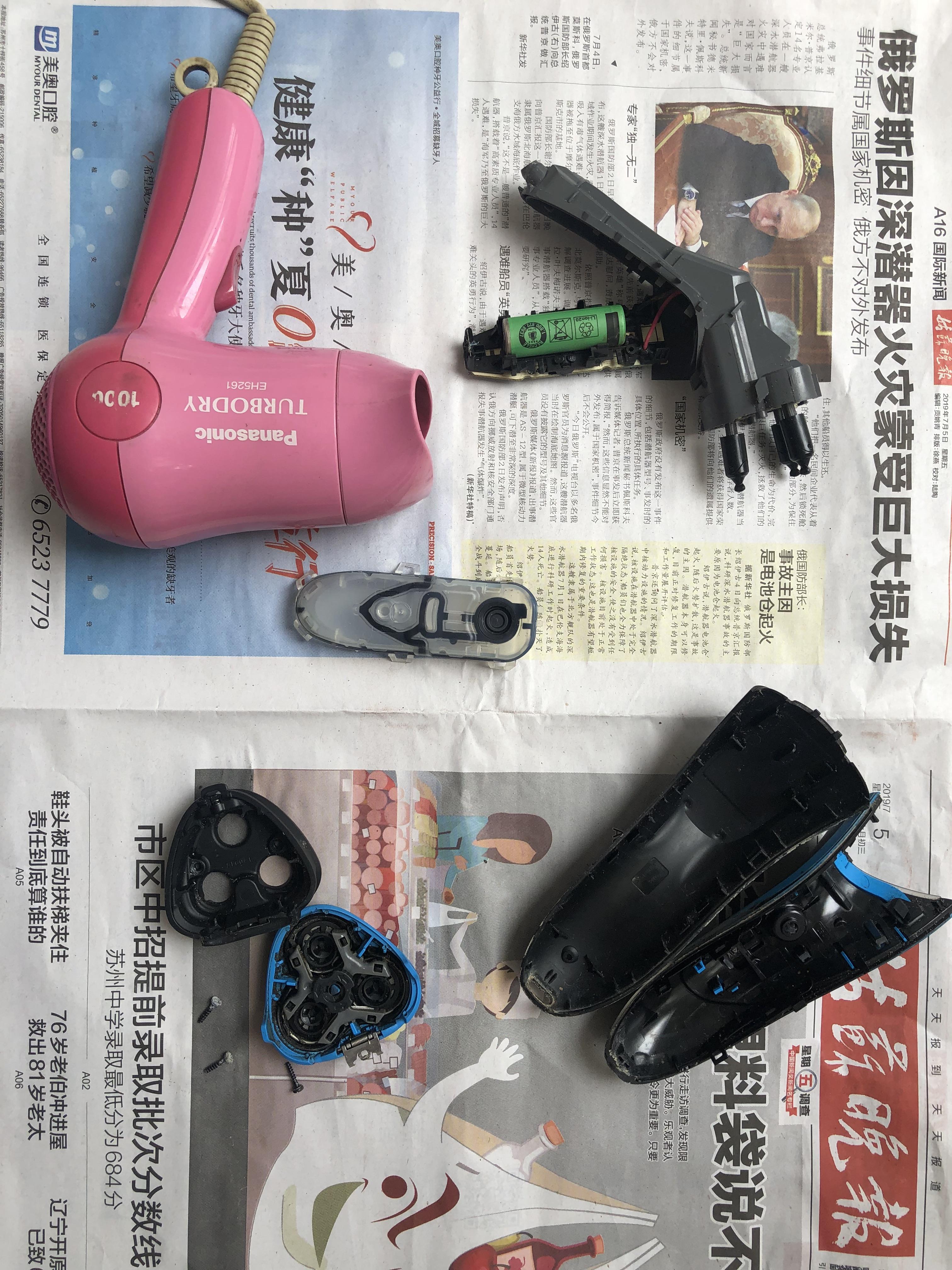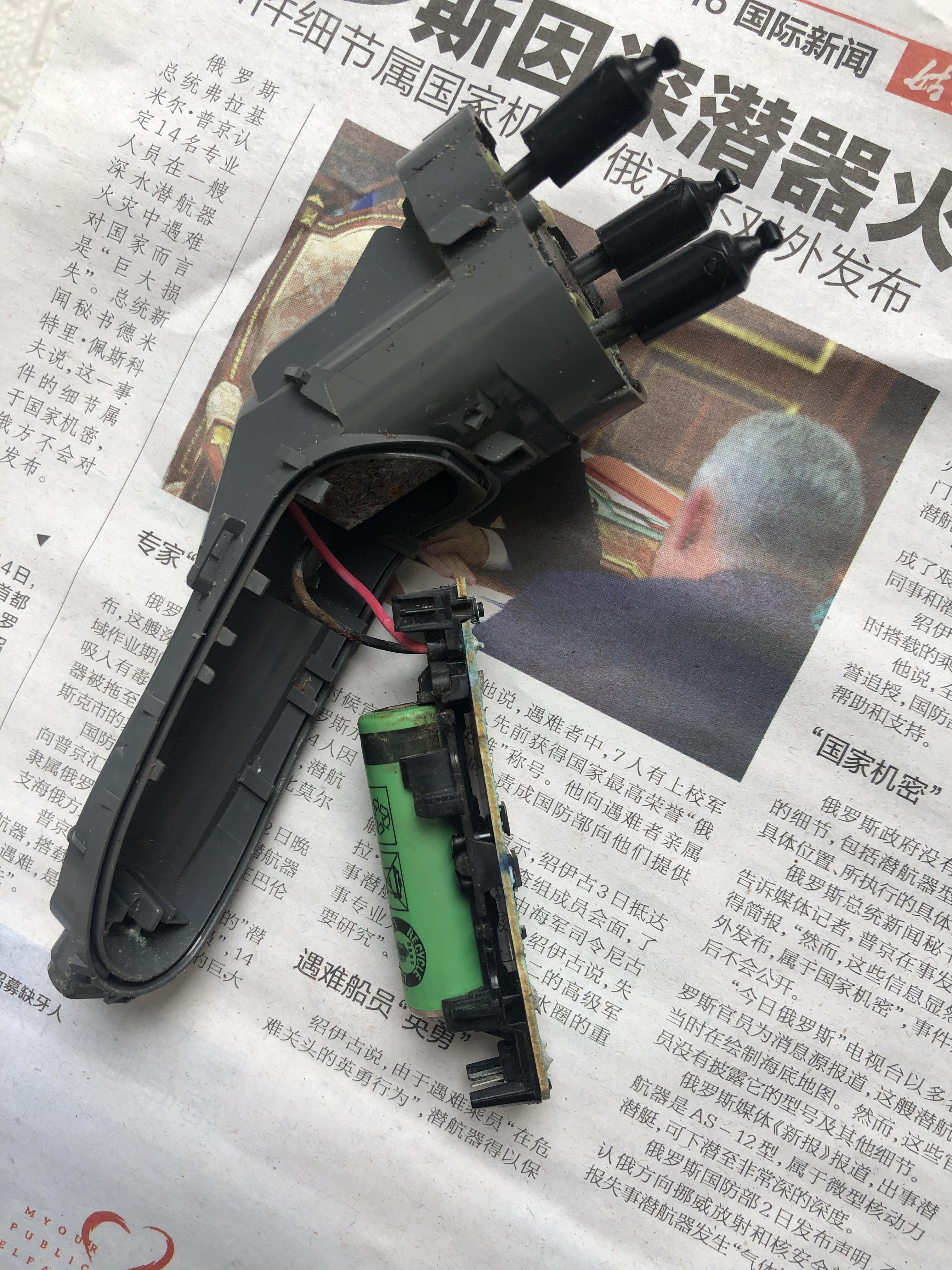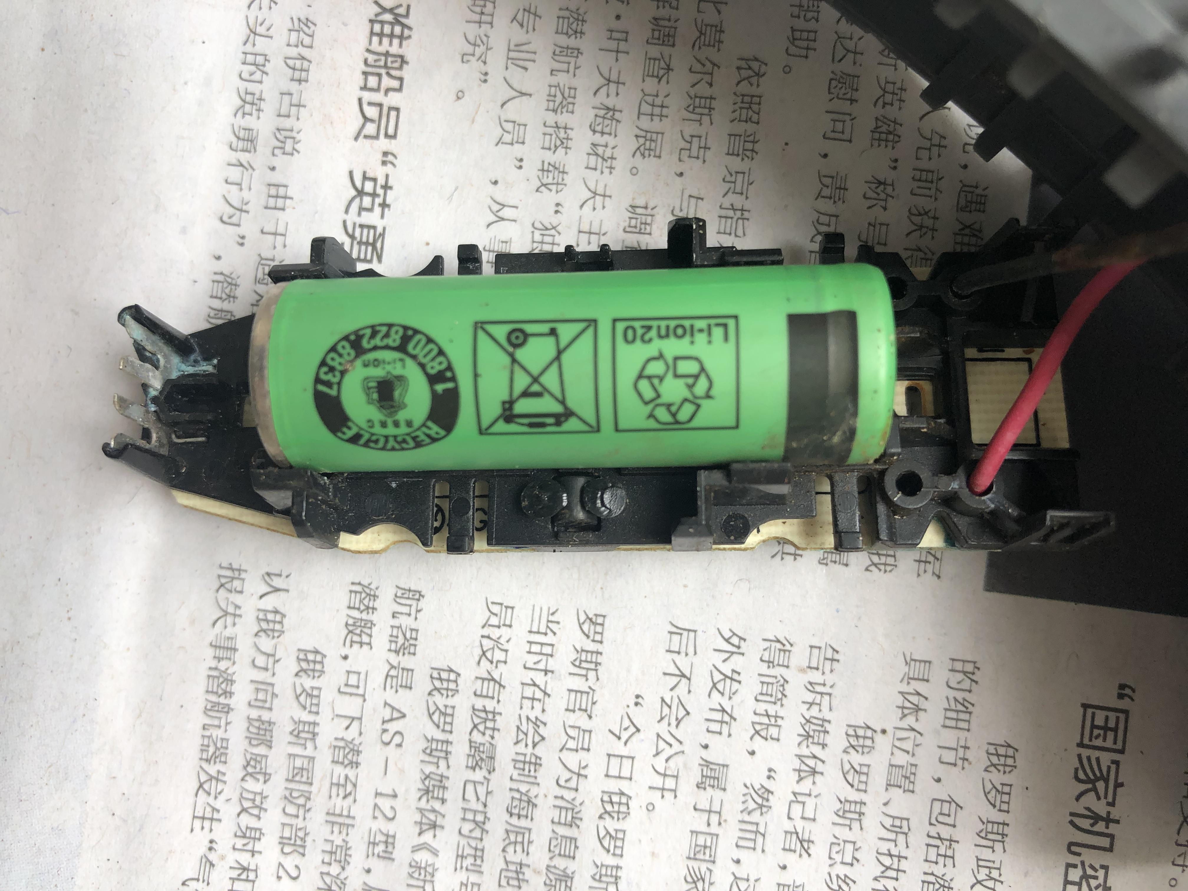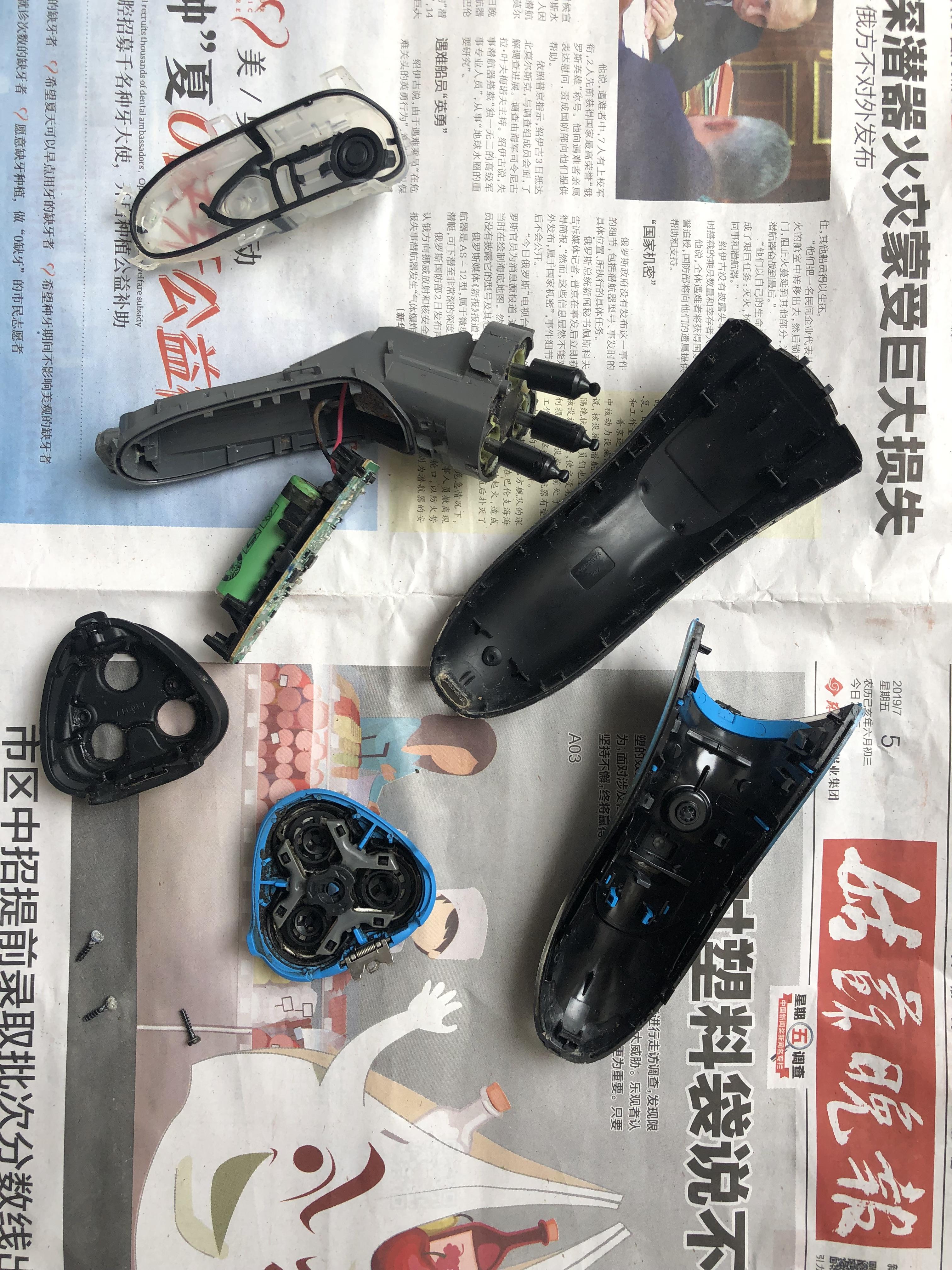 我的这把剃须刀拆解后发现是进水了。我进行了清理,去掉短头发等脏污,并用电吹风将里面的水吹干,期初剃须刀还是断断续续工作,后来等吹干零部件后,运转逐渐正常。为防止反反复复,对里面所有的部件都进行了一次清理,尤其是电路部分要小心,不能进水。电池部分,我仔细观察了,正负极焊接在电路板上,在以后电池报废后更换新的电池时要先用烙铁熔下原来的焊接头,接下来将新的电池焊接上去,注意要配上与原电池一样的电流、电压等参数,最好买那种已经焊接好正负极的带脚的电池,拿回来直接焊接上去,比较省事。