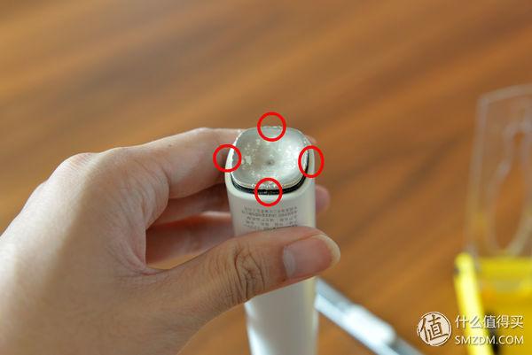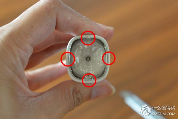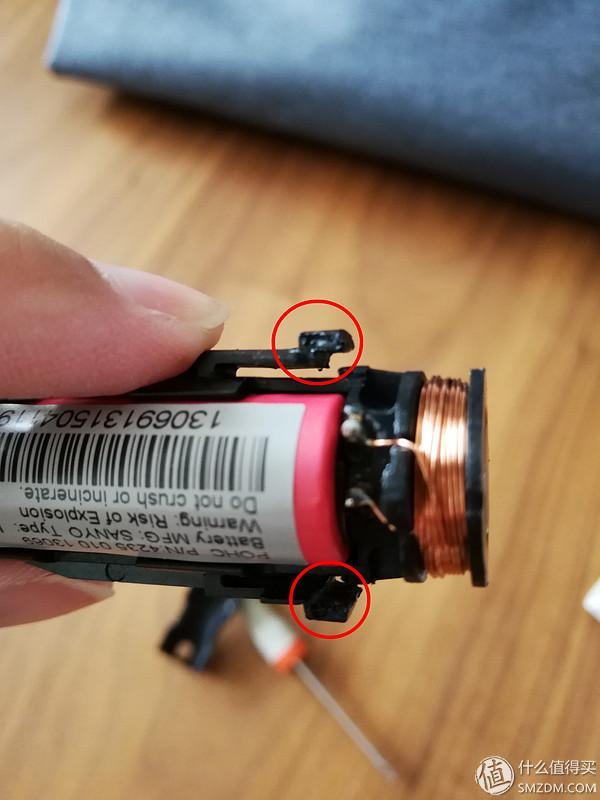 ▼打开后盖底部的样子就是这样的,核心机体一共有两个卡扣,楼主标出的红圈处。这时候需要用到一个小的一字口螺丝刀深入到这两处卡扣处,并向中心位置拨动,同时顶住牙刷头处的震动杆,这样的话机体就弹出来了。只要掌握了方法,10秒钟就能把机体取出来。 (PS技巧:翘好一侧后转一下里面机体,防止卡扣又卡回去了)